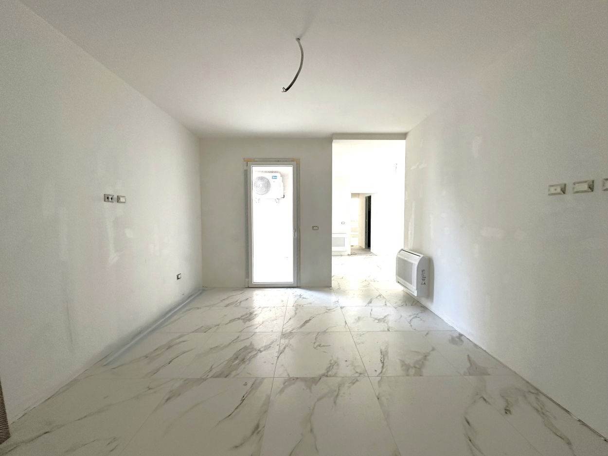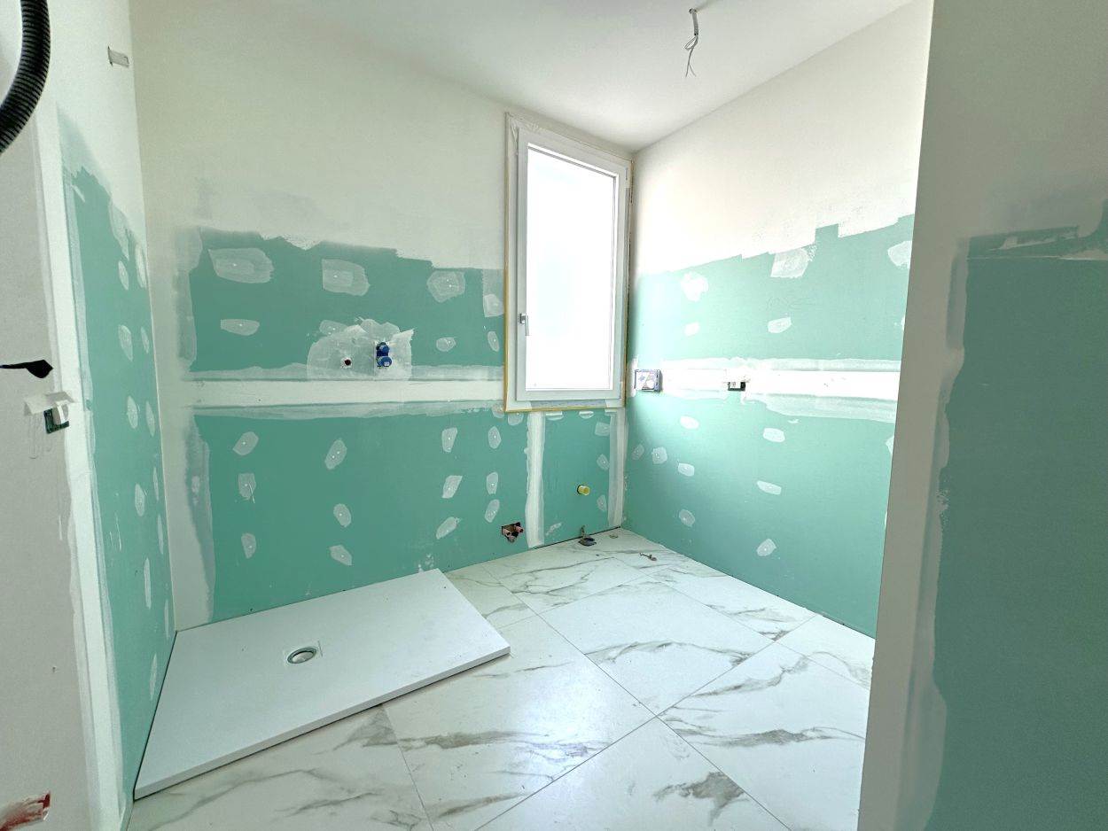 L' appartamento è composto da ingresso su soggiorno con cucina open space, ripostiglio, disimpegno, due camere da letto e due bagni di cui uno finestrato. Possibilità di garage e/o cantina al piano terra.