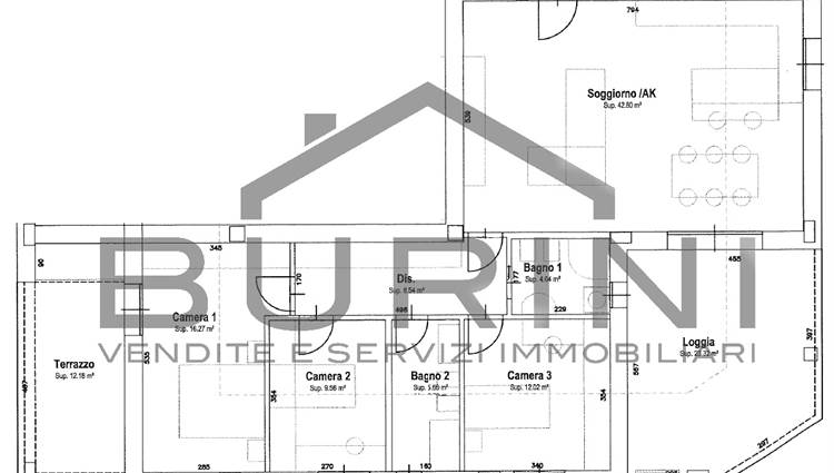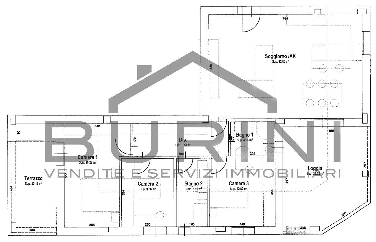 L'immobile, posto al terzo ed ultimo piano servito da ascensore, è composto da ingresso su soggiorno con cucina a vista di mq. 42,8 in affaccio a ampia e comoda loggia, disimpegno notte, tre camere da letto, di cui la matrimoniale con terrazzo privato e due bagni entrambi finestrati.
