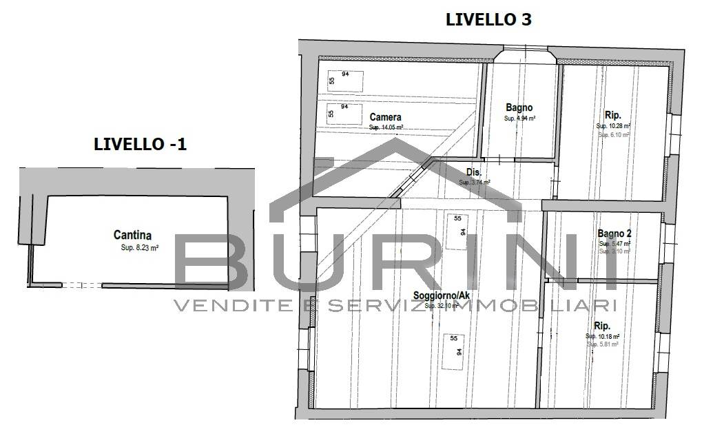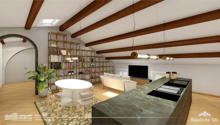 Piano terzo: zona giorno openspace, disimpegno, camera da letto matrimoniale, due ripostigli/camerette/studi e 2 bagni entrambi finestrati.
