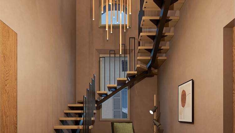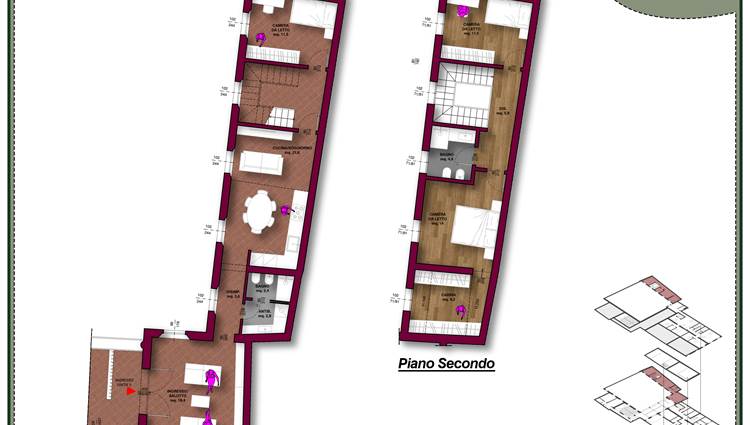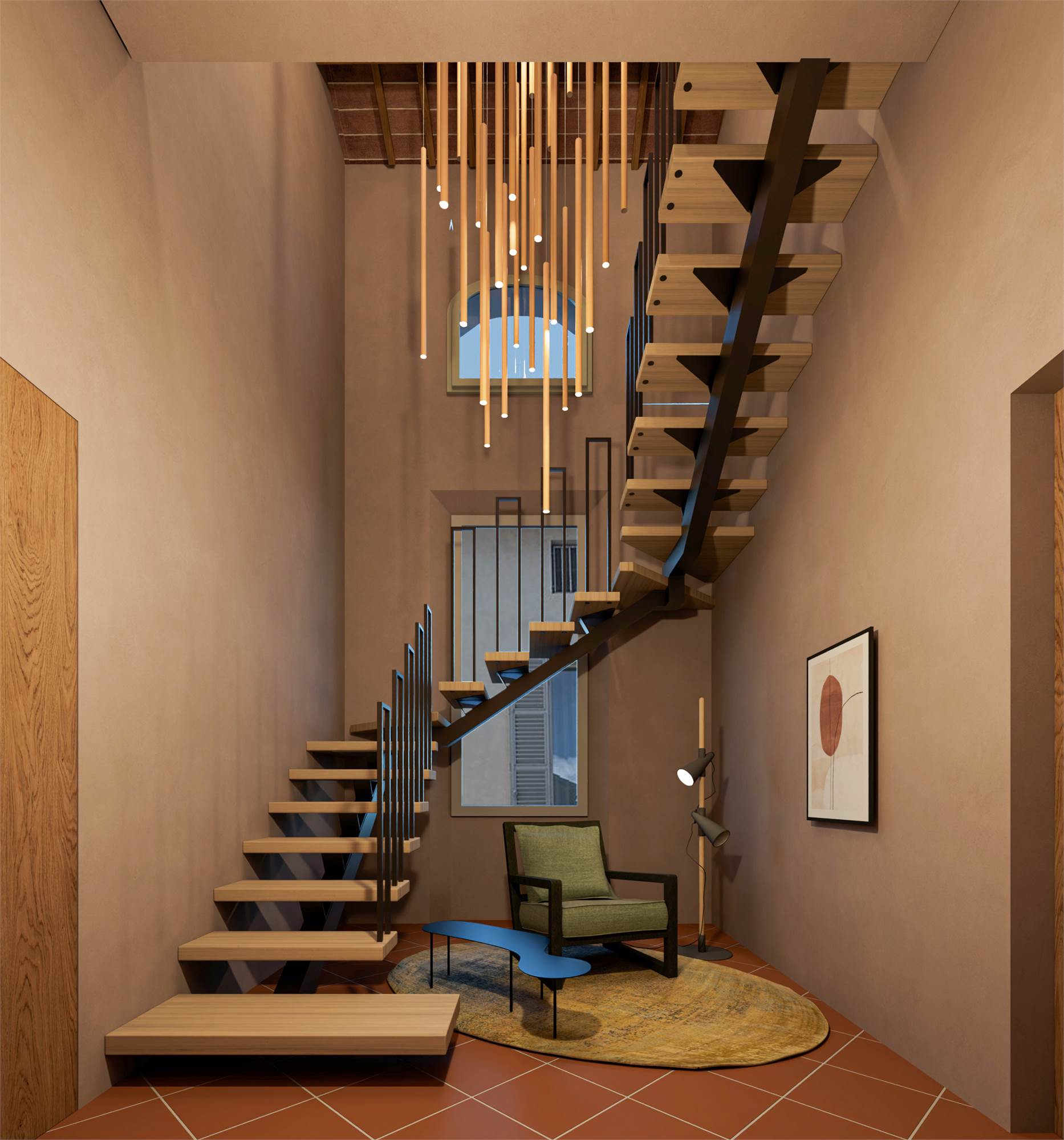 L'appartamento è accessibile sia da scalone monumentale che da ascensore, ed è composto al piano primo da ingresso su salotto di circa 18 mq, soggiorno/cucina con antibagno e bagno, vano scale e studio/ terza camera, mentre il piano secondo è composto da camera matrimoniale con cabina armadio, bagno finestrato ed ampia camera singola.